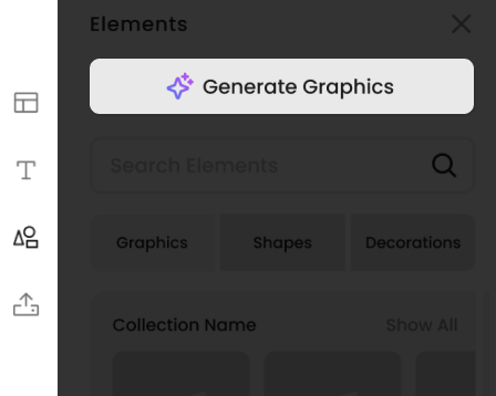 Gehen Sie zum Vexels Designer, wählen Sie den Bereich Graphics AI in der linken Symbolleiste und klicken Sie auf "Generate Graphics".