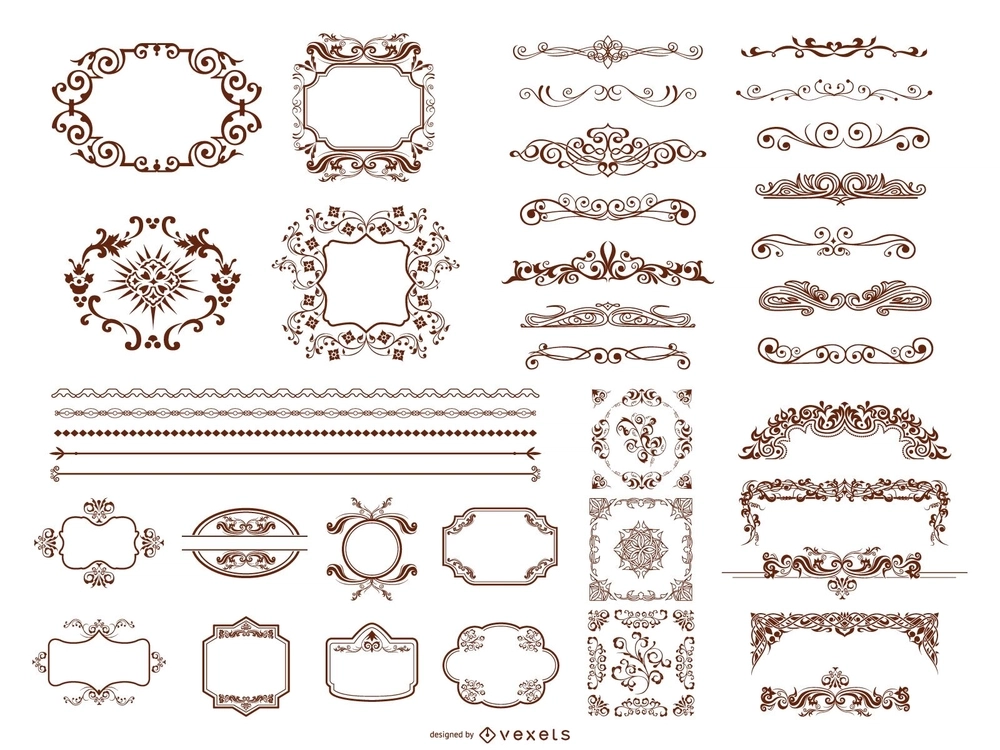 Riesiges Set mit floralen Ornamenten im Retro-Stil in rund 40 verschiedenen Stilen mit mehreren wirbelnden lockigen Blumendämpfen Kriechblättern kleinen Blütenblättern Linien dekorativen Rändern und anderen Elementen in verschiedenen Layouts und Formen in braunem Farbschema.