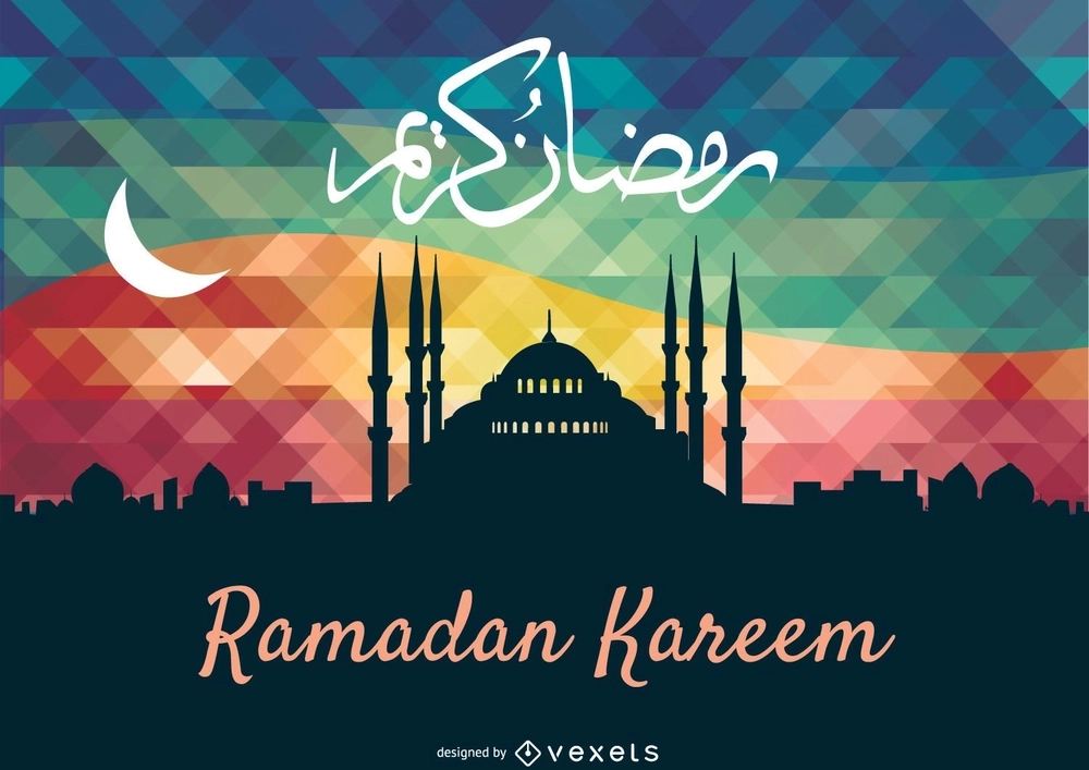 Ramadan-Grüße in der arabischen kalligraphischen Schrift über buntem Hintergrund mit Mond. Eine islamische Grußkarte für den heiligen Monat Ramadan Kareem. Die Moschee Hagia Sophia im Hintergrund. Hochwertiges JPG enthalten. Unter Commons 4.0. Namensnennungslizenz.
